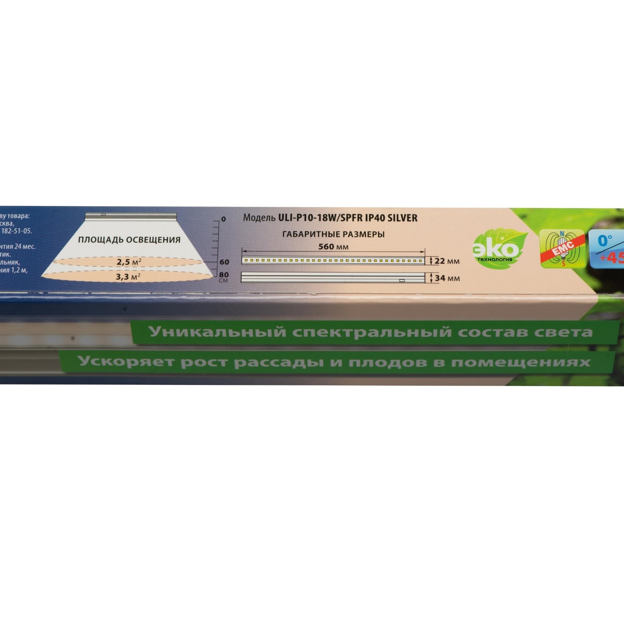 ULI-P10-18W/SPFR IP40 SILVER Светильник для растений светодиодный линейный, 560мм, выкл. на корпусе. Спектр для фотосинтеза. TM Uniel